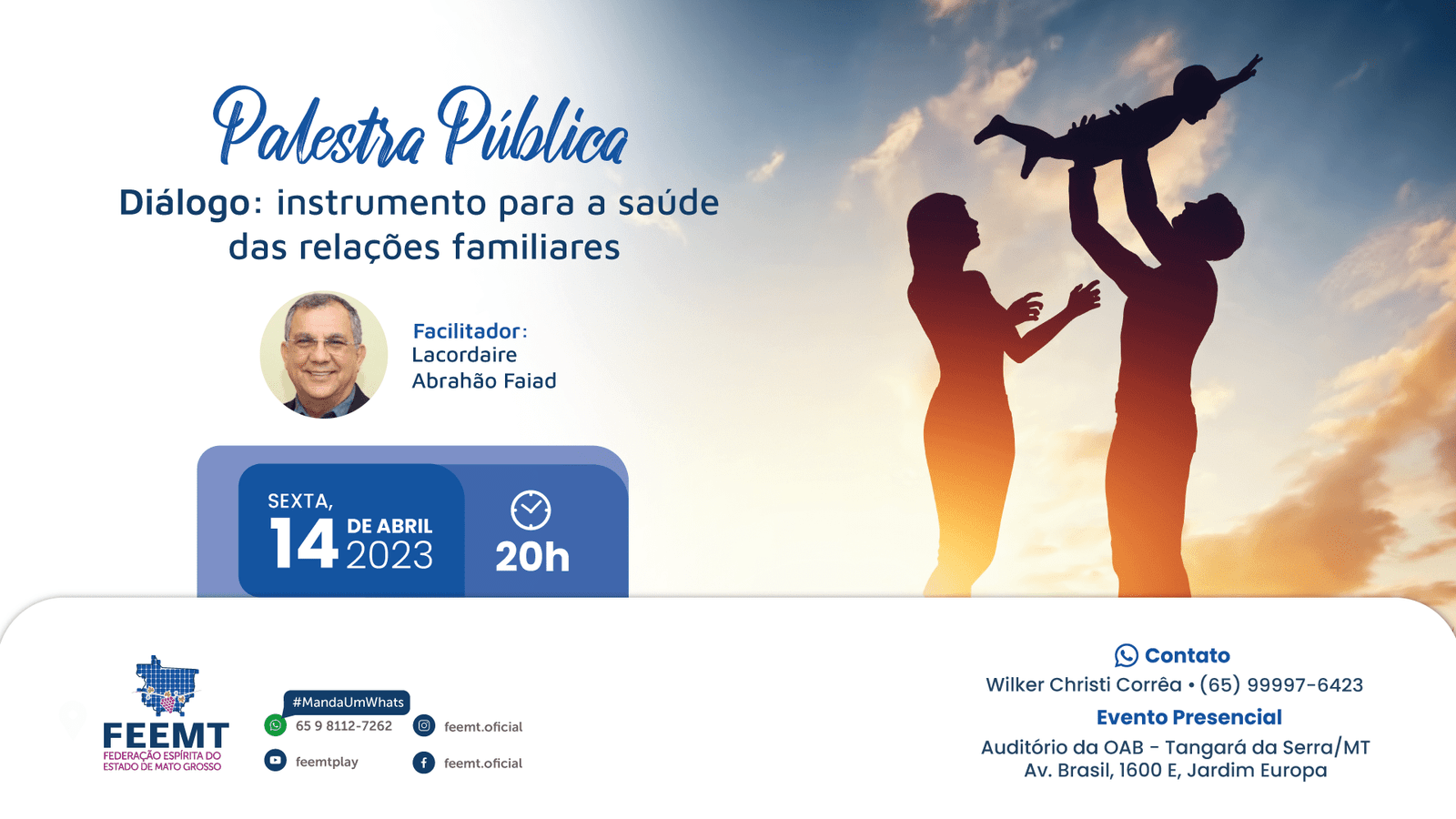 Palestra pública. No dia 14 de abril (sexta-feira), realizaremos a palestra com o nosso facilitador Lacordaire Faiad. Horário: 20h (Horário de Mato Grosso) Tema: Diálogo: instrumento para a saúde das relações familiares EVENTO PRESENCIAL: Auditório da OAB…